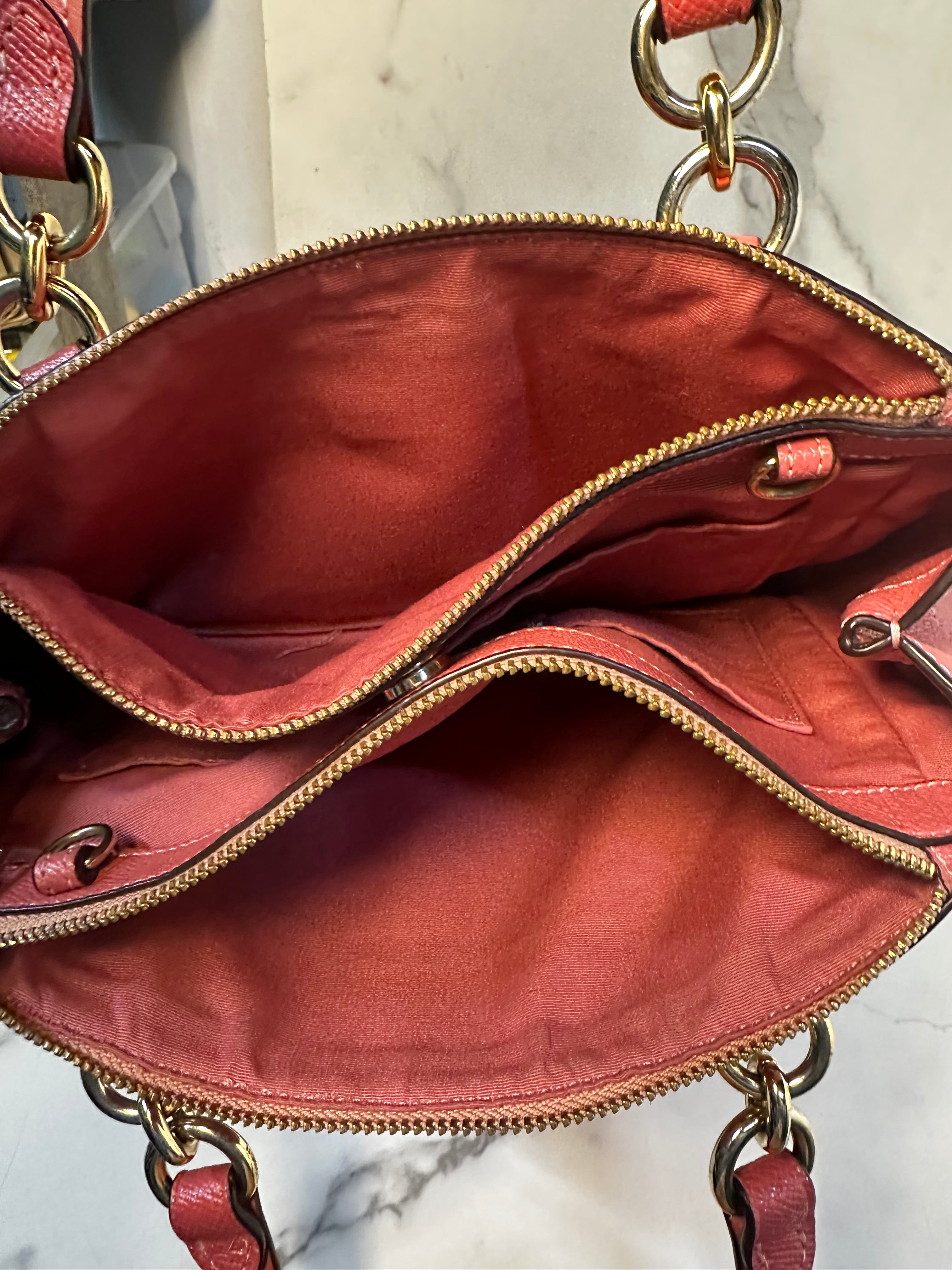 This Coach Purse is featured in the color pink. This purse is in good condition, see photos.